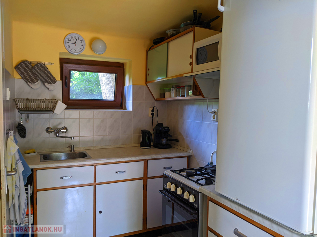A nyaraló 55 m²-es, az 1970-es évekből származik, de 2000-ben teljes műszaki, 2020-ban pedig esztétikai felújításon esett át, így egyesíti a régi balatoni hangulatot a modern kényelemmel.