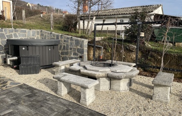 A ház mellett kialakított exkluzív kerti pihenőtér a nyári esték tökéletes helyszíne: fedett terasz, fatüzelésű dézsa jakuzzi funkcióval, valamint hangulatos Jován XXL tűzrakóhely szolgálja a kikapcsolódást. A kertben egy 9 m²-es szerszámos ház is helyet kapott.